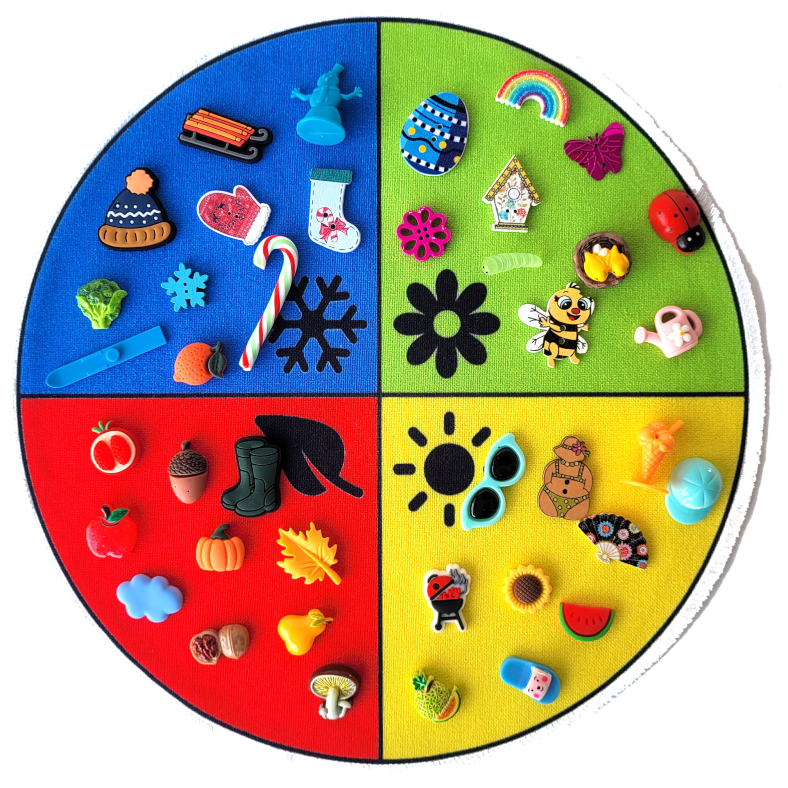 • Aastaaegade sorteerimisratas ja miniatuursed mängufiguurid – hariv ja loov mängukomplekt lastele.