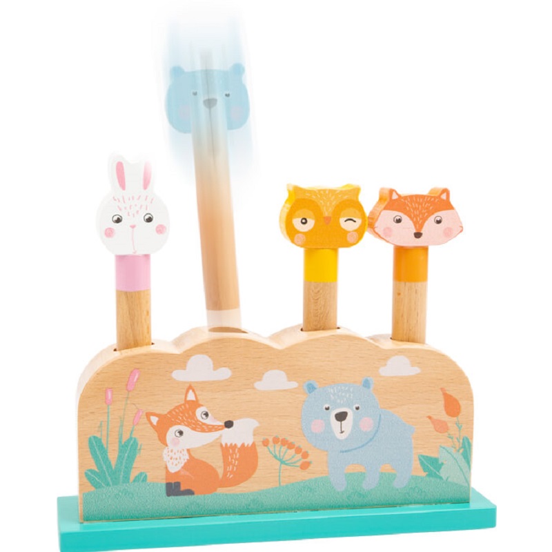 Kes nüüd hoogsalt ringi hüppab? Naturaalsest puidust võluvad metsloomad tuleb sisestada avadesse. ning kuna augud on vedrudega varustatud, hüppavad väikesed loomad kiiresti tagasi välja. Põnev vahend, mis treenib läbi mängu lapse motoorseid oskusi ja käte ning silmade koordinatsiooni.