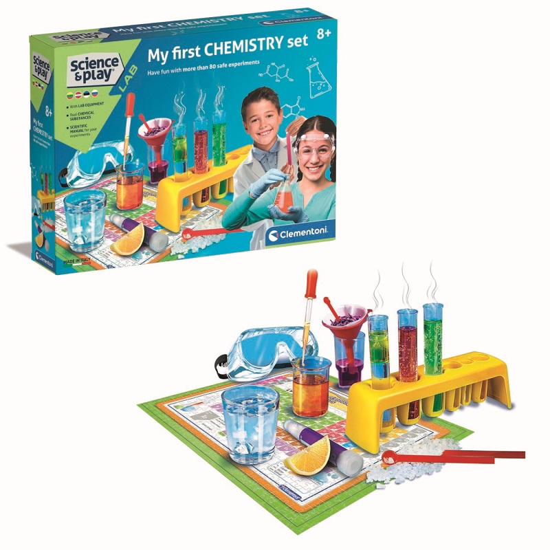 Komplektis: kaitseprillid, kaantega kolvid, korkidega kaitseklaasid, pudelihari, segaja, pipett, katseklaasi turvavõti, lehter, katseklaasi raam, kühvel, filterpaber, pintsetid, keemilised ained (vask(II)sulfaat, viinhape, indikaatorit eraldav(bleeding) universaalindikaatorpaber), perioodilisustabeli pusle, kasutusjuhend.