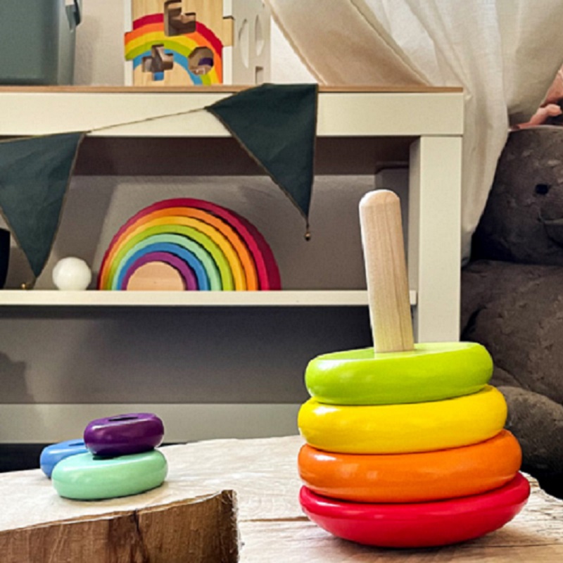 Lapsele parajalt väljakutseid pakkuv vikerkaare värvides ladumistorn toetab väikelaste peenmotoorika arengut, kui nad püüavad laduda värvilisi kettaid puidust pulga otsa.
