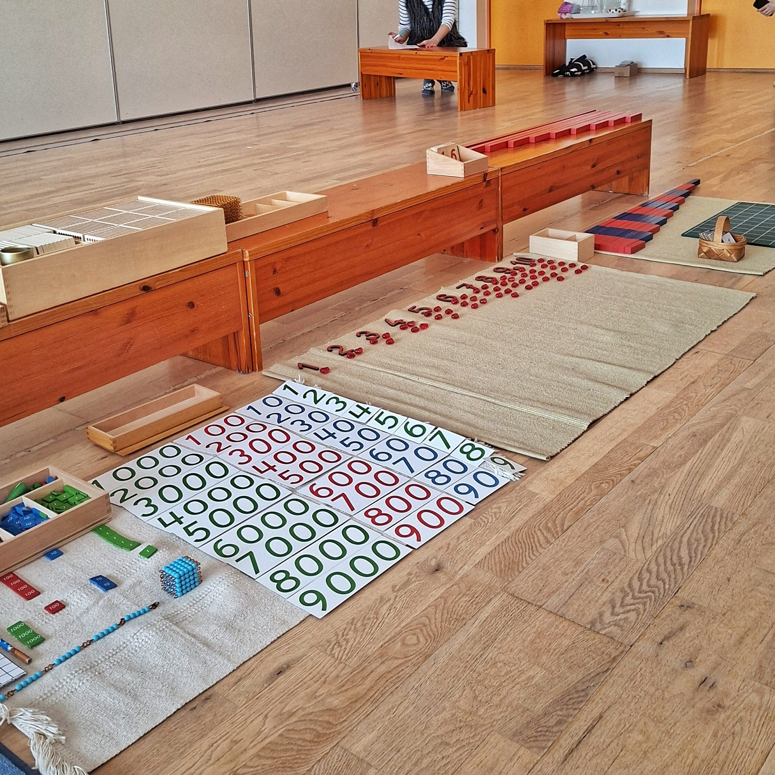 Kohaväärtused (1, 10, 100, 1000, 10 000) on selgetes Montessori pedagoogikast tuttavates värvides.