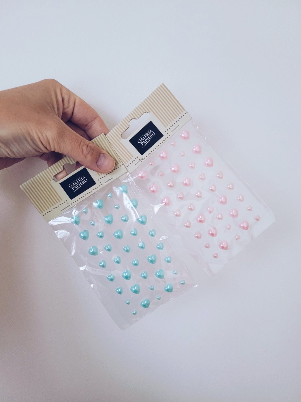 - Südamekujulised helesinist värvi poolpärl kleebised.