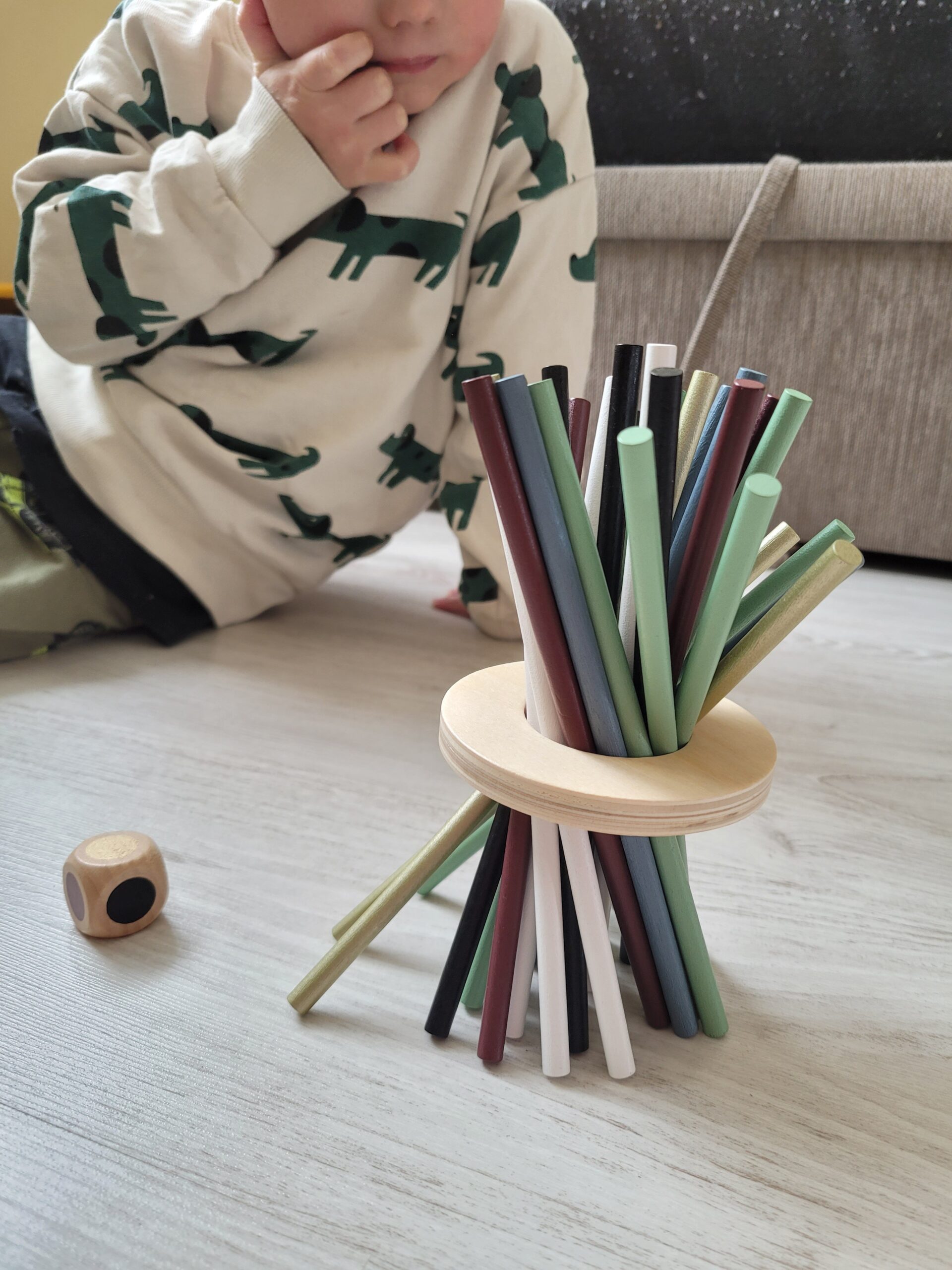 Selle vertikaalselt mängitava osavusmänguga saab arendada osavust, loogikat ning nutikust!Lapsel on pulkasid mugav haarata ning käes hoida. Lisaks saab laps õppida vähem tuntud värve – purpur, kuldne, salveiroheline, taevasinine jne.