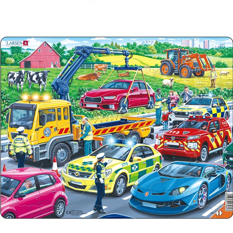 Maanteel on juhtunud intsident ja paljud on valmis aitama, sündmuskohale on kohale tulnud politsei, tuletõrjujad ja arst, et aidata punases autos viibinud perekonda. Õnneks keegi viga ei saanud ning puksiirauto tõstab auto masina peale. Politseinik juhib liiklust alarmsõidukitest mööda. Mõned tükid on kujundatud autode, kraanaauto, küüni, traktori ja liiklust juhtiva politsei järgi.