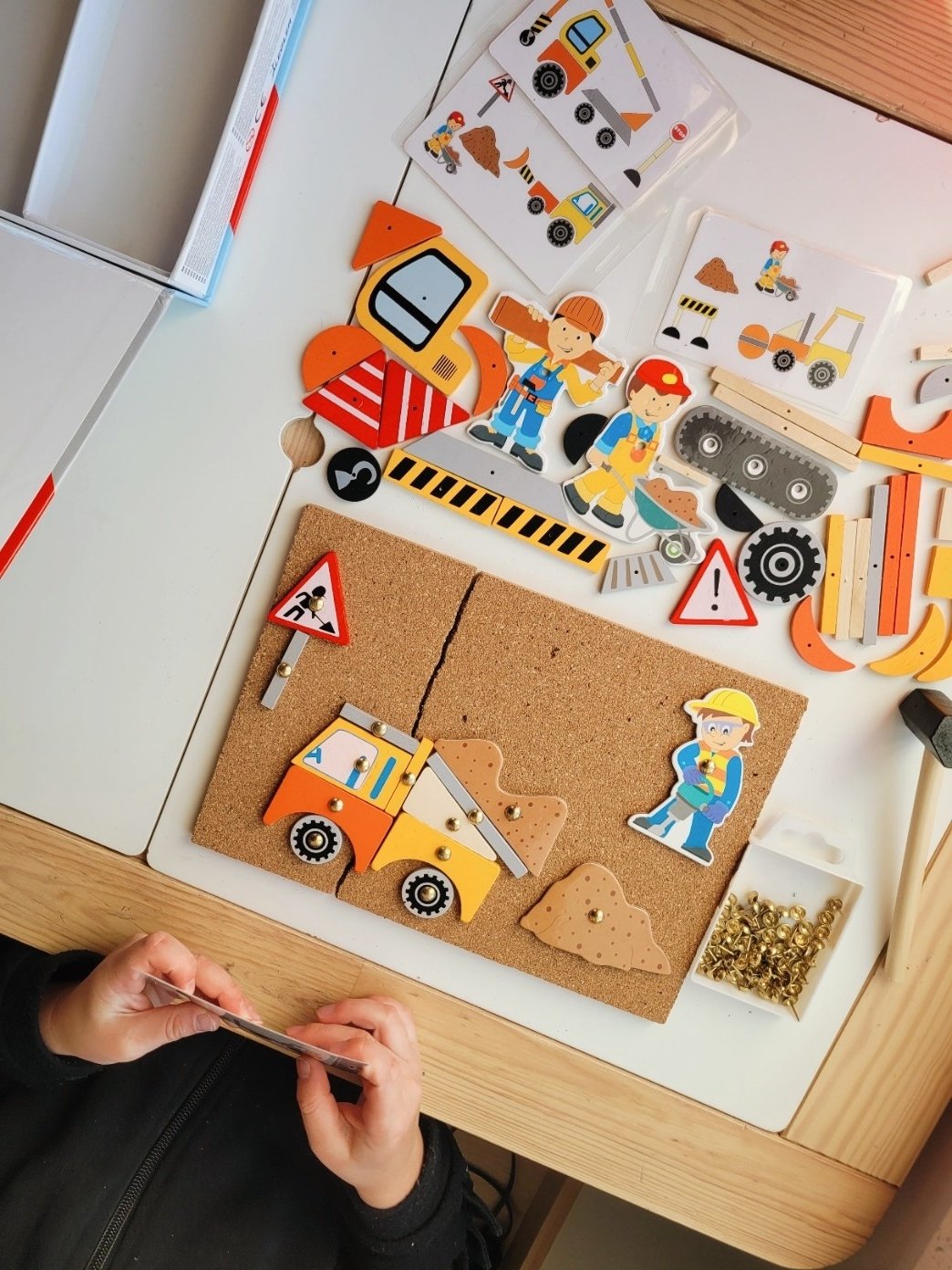 Loominguline mäng, peenmotoorika arendamine ja lõbus toksimine ühes! Selle haamrimänguga saab korkplaadile toksida erinevaid ehitusplatsiga seotud motiivid, millest saab laps kujundada endale meelepärase pildi. Kaasas on hoiukarp, millega on mängu mugav kaasas kanda ja neli näidiskaarti, mis annavad ideid piltide loomiseks.
